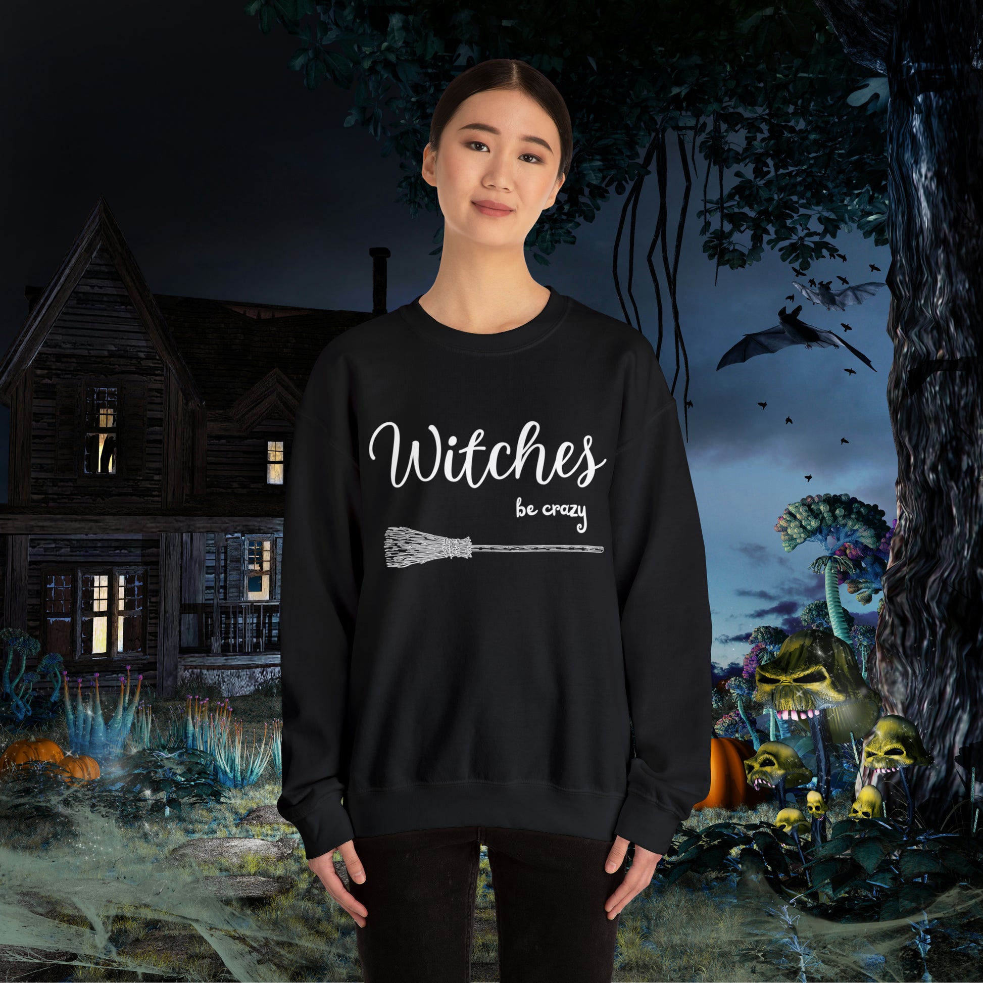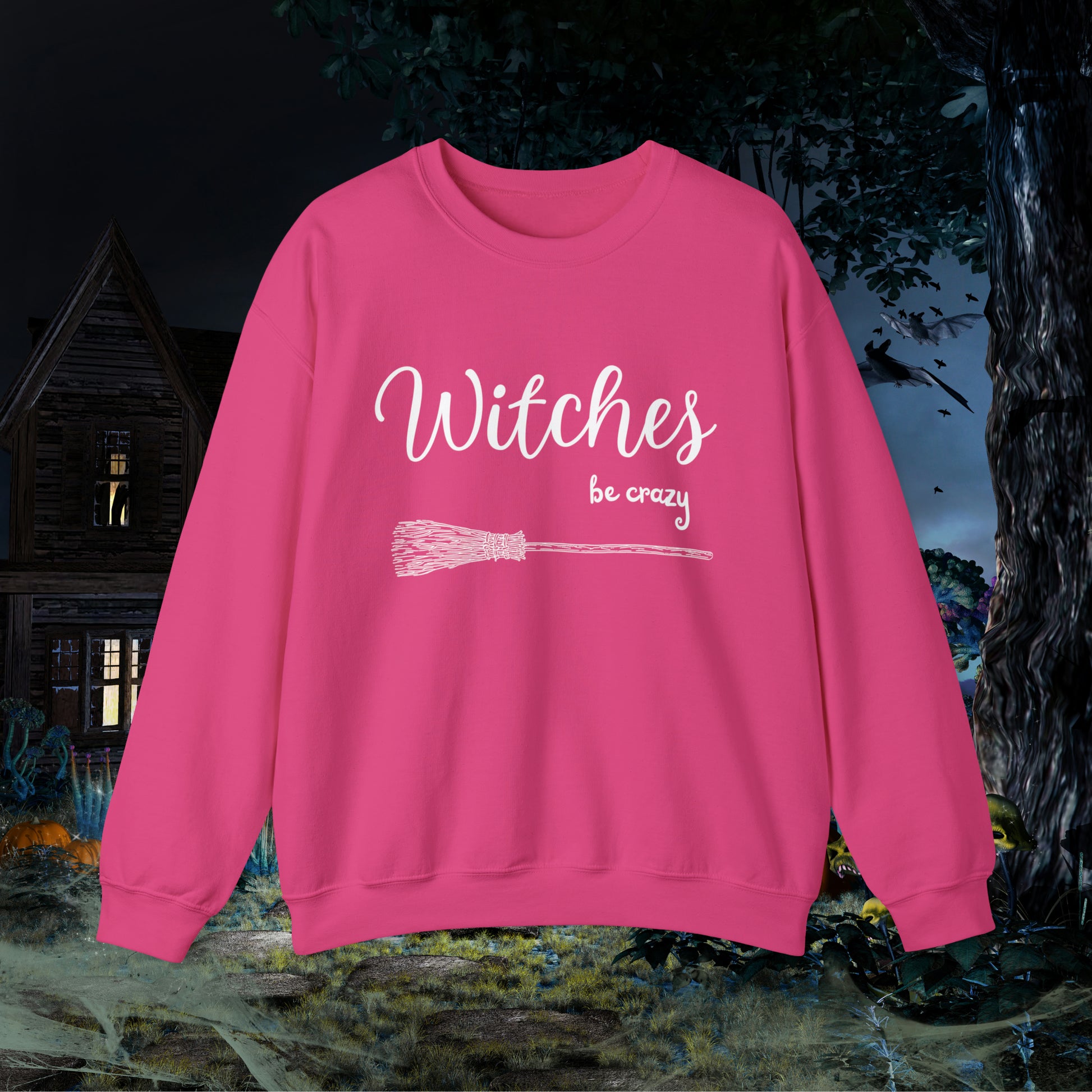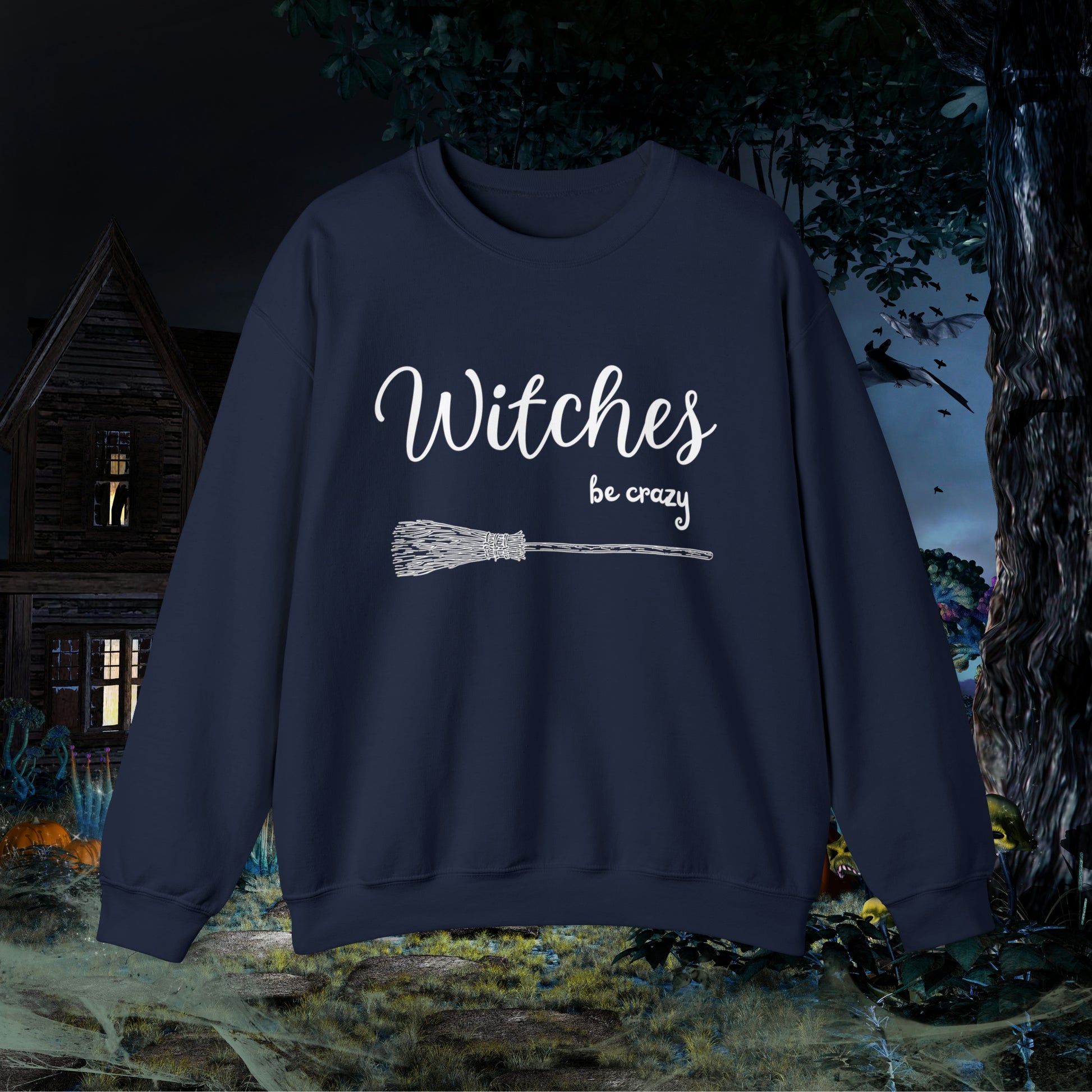 Get ready to show off your wicked sense of humor with our "Witches Be Crazy" funny Halloween sweatshirt! This fun and quirky sweatshirt is perfect for anyone who loves Halloween, witchcraft, or just wants to embrace their wild side. Made from soft and comfortable fabric, this sweatshirt is perfect for every day wear or as a statement piece for parties and events. The bold lettering and eye-catching design make it a great conversation starter wherever you go. Whether you're a witch yourself or simply appreciate the magic of the season, our "Witches Be Crazy" sweatshirt is a must-have addition to your wardrobe. Ideal for any situation, a unisex heavy blend crewneck sweatshirt is pure comfort. These garments are made from polyester and cotton. This combination helps designs come out looking fresh and beautiful. The collar is ribbed knit, so it retains its shape even after washing. There are no itchy side seams on these sweaters. .: 50% cotton, 50% polyester .: Medium-heavy fabric.